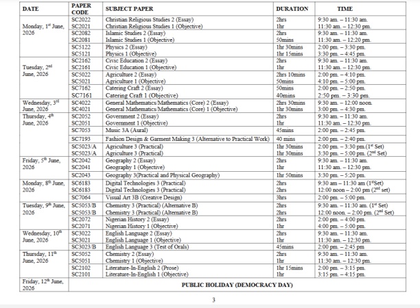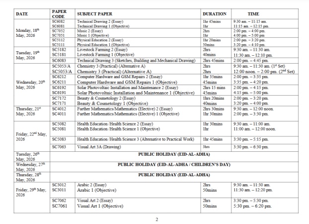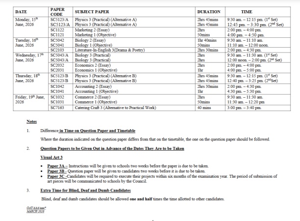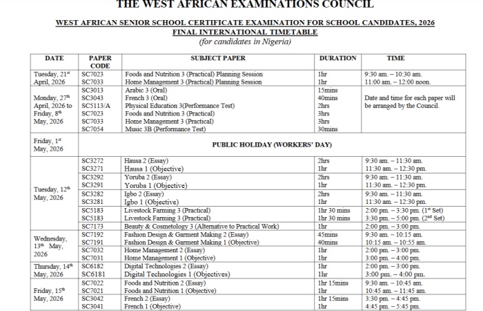 The West African Examinations Council has released the timetable for the 2026 West African Senior School Certificate Examination for school candidates.